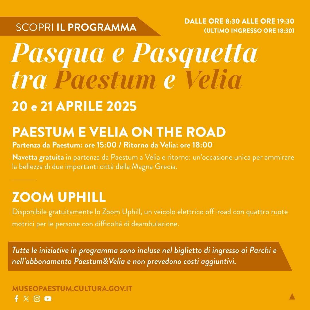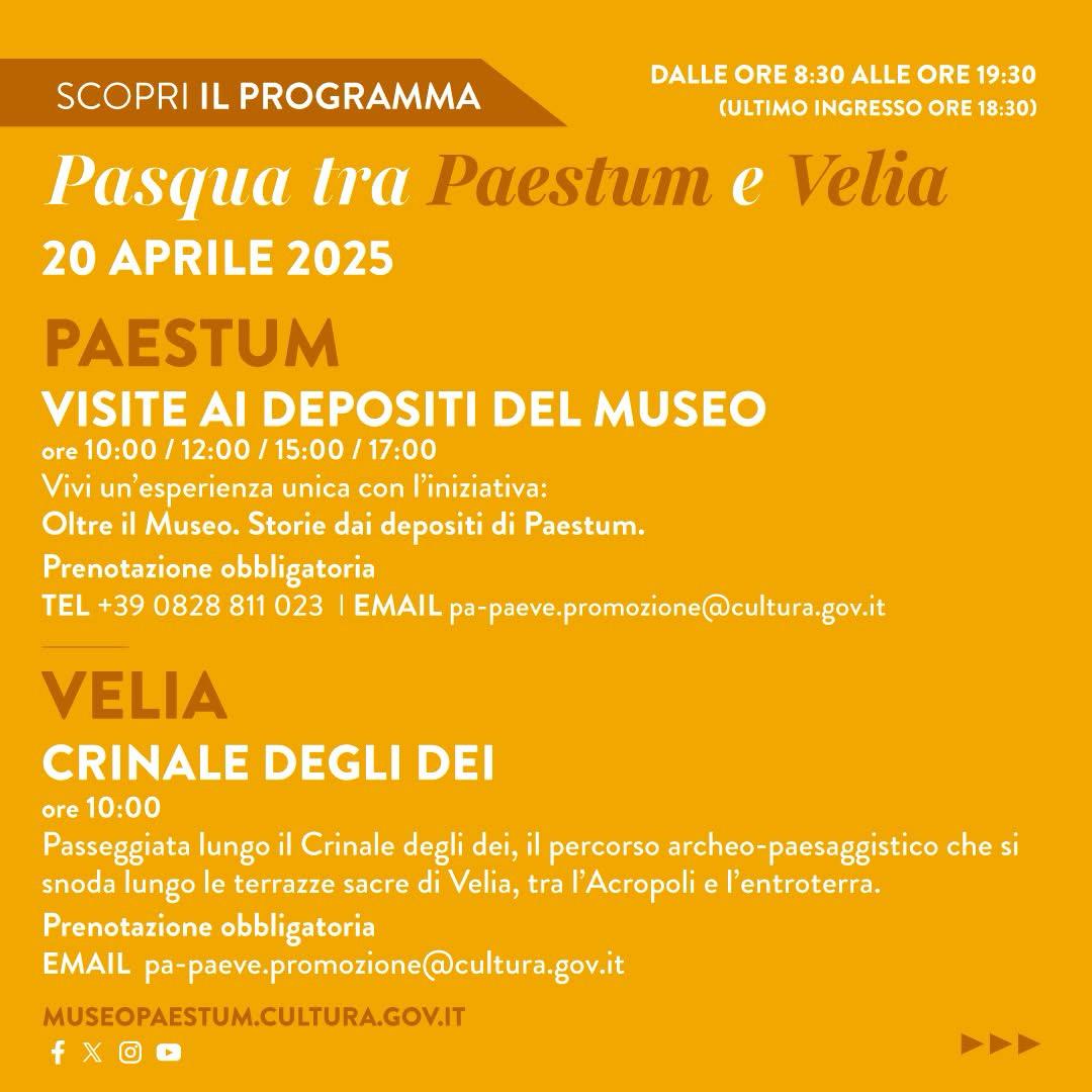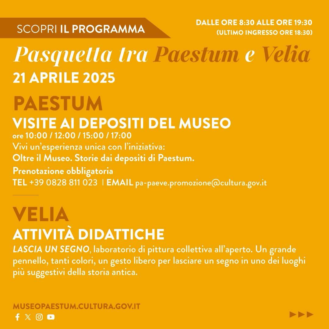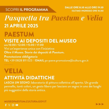 Domenica di Pasqua, 20 aprile 2025 e lunedì di Pasquetta, 21 aprile 2025, l’area archeologica e il Museo di Paestum e l’area archeologica di Velia saranno regolarmente aperti dalle ore 8:30 alle ore 19:30 (emissione ultimo biglietto ore 18:30).