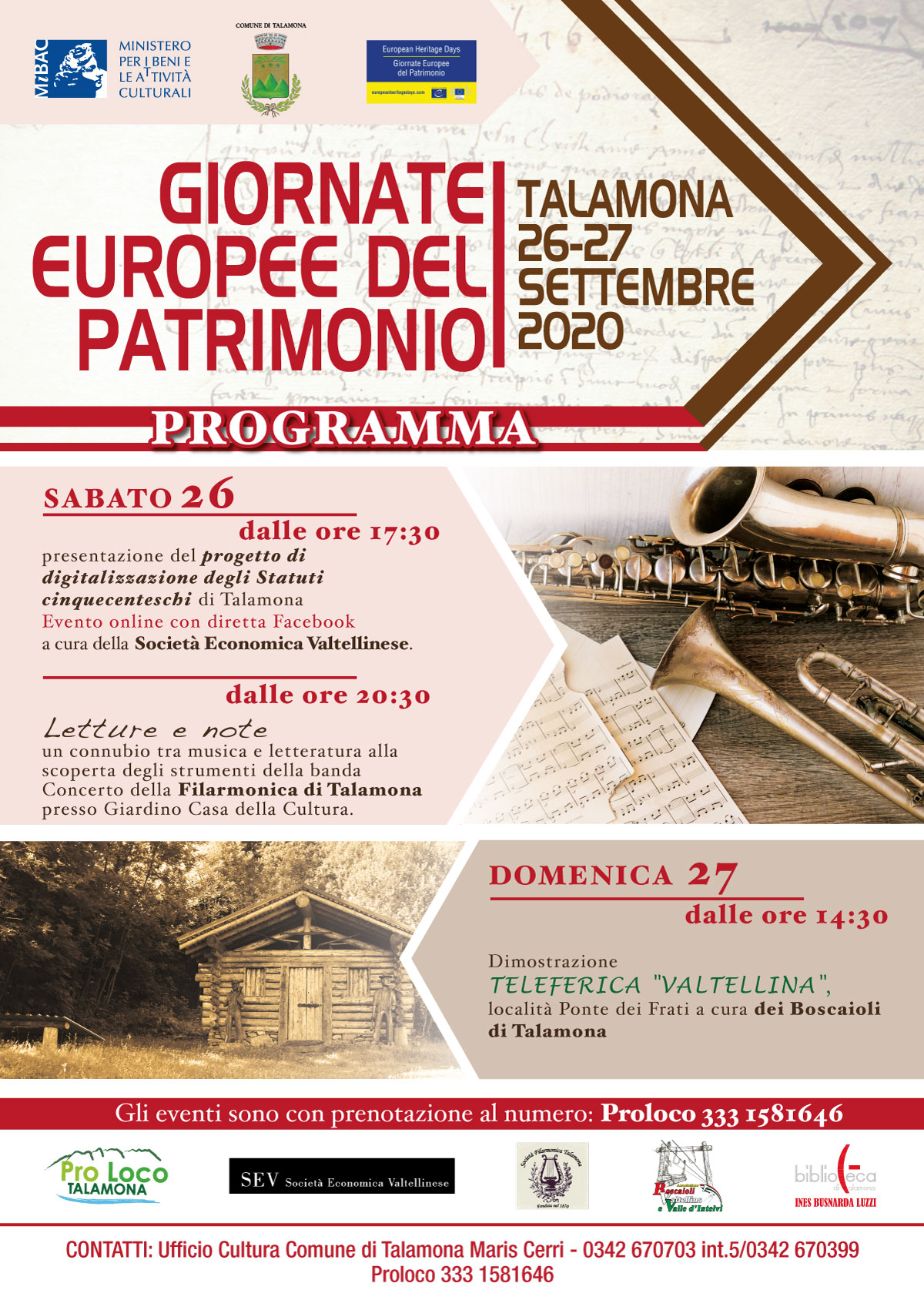 • sabato 26 settembre, nel pomeriggio (ore 17.00), si terrà concerto fortemente simbolico della Filarmonica di Talamona nel 150esimo anniversario della costituzione: “Musica Maestro”, presso il giardino della Casa della Cultura;