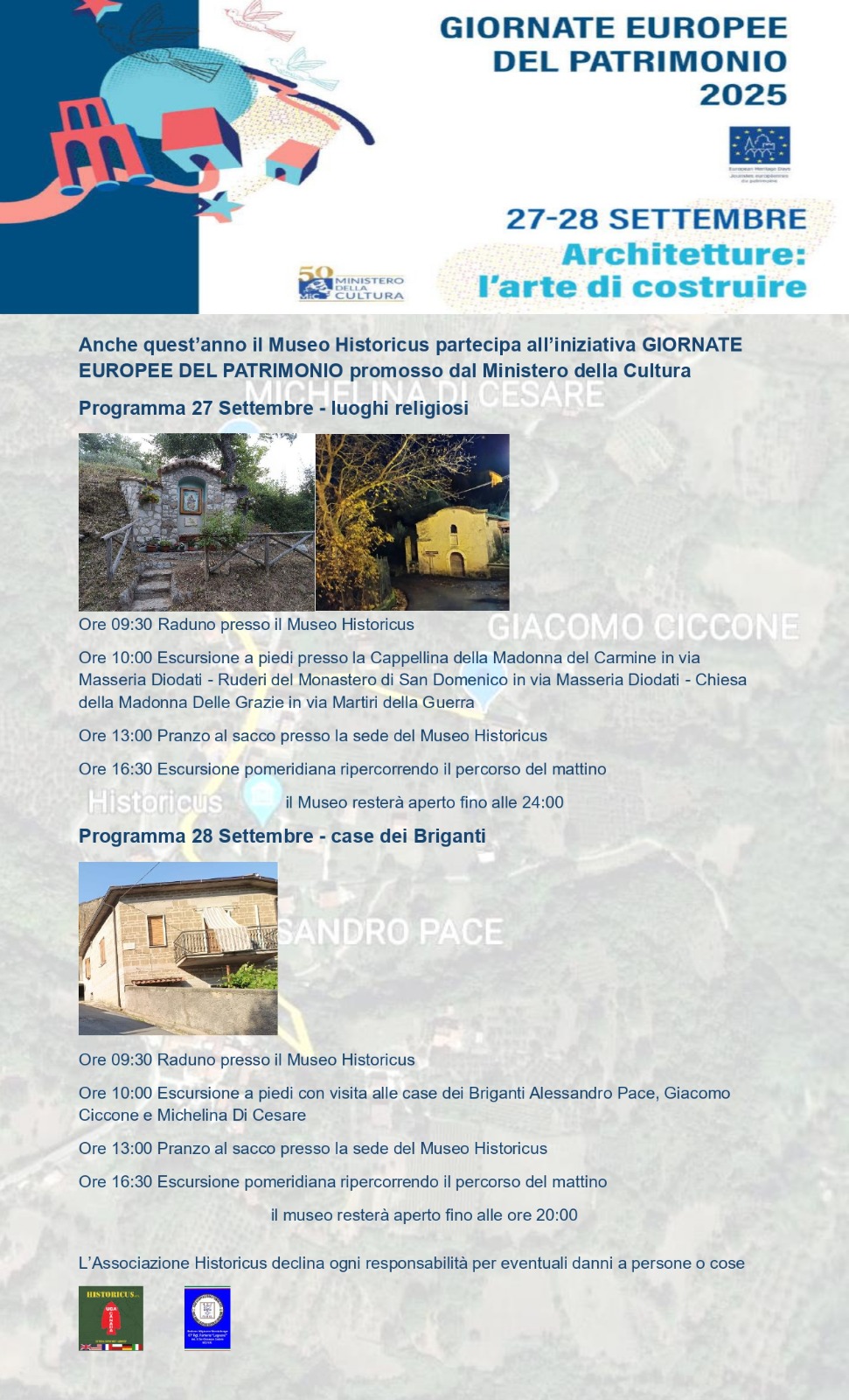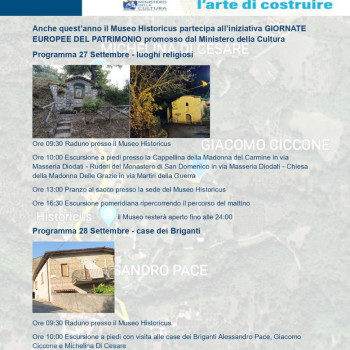 Visite guidate presso chiese, monumenti religiosi e luoghi di interesse storico del territorio (case dei briganti) e mostra di documenti e foto per quanto riguarda i luoghi ormai non più accessibili come il Castello di Caspoli.