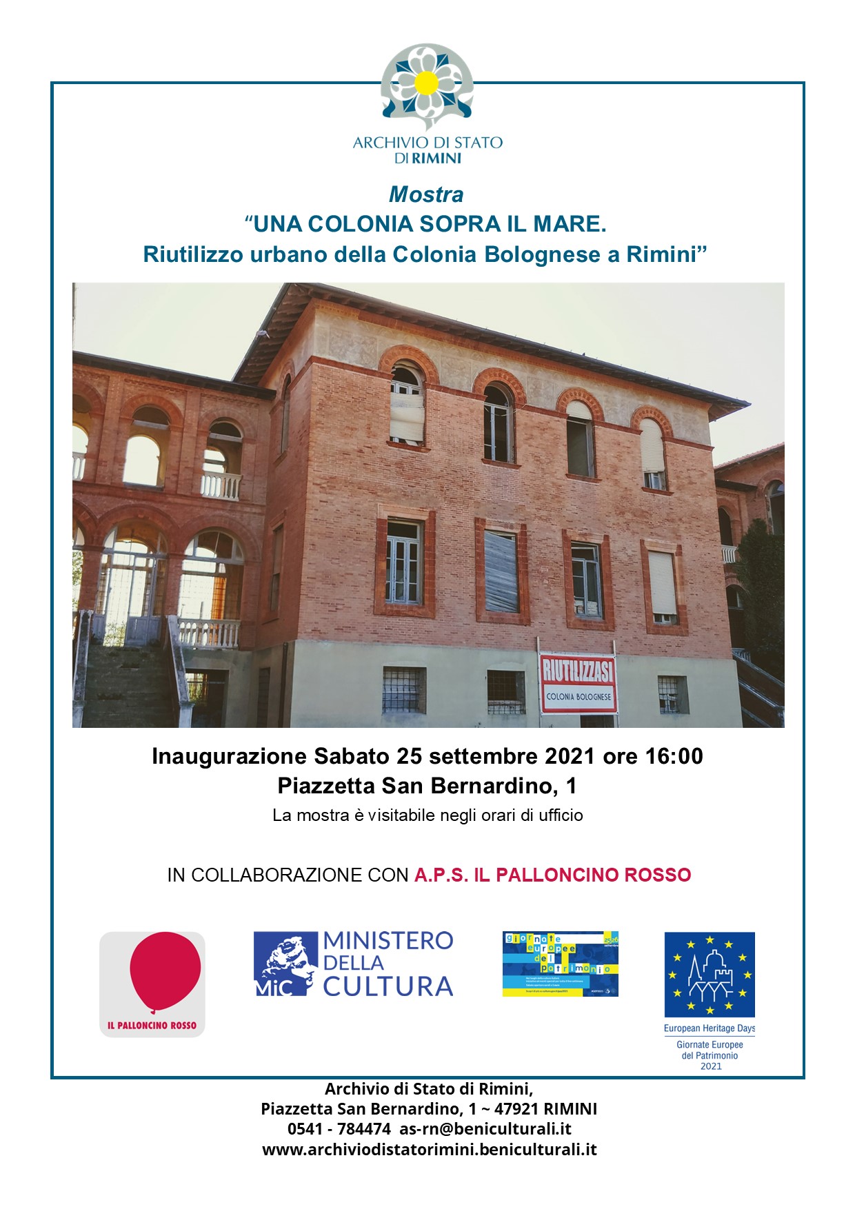 In occasione delle Giornate Europe del Patrimonio (G.E.P.) 2021, l'Archivio di Stato di RIMINI, in collaborazione con A.P.S. Il Palloncino Rosso, sabato 25 settembre 2021 alle ore 16:00 inaugura la mostra: "UNA COLONIA SOPRA IL MARE. Riutilizzo urbano della Colonia Bolognese a Rimini.