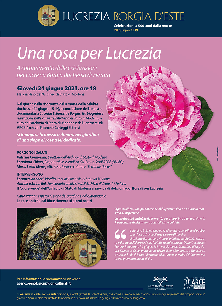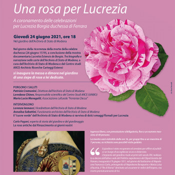 Nel giorno della ricorrenza della morte della celebre duchessa (24 giugno 1519), a conclusione della mostra documentaria "Lucretia Estensis de Borgia. Tra biografia e narrazione nelle carte dell'Archivio di Stato di Modena", a cura dell’Archivio di Stato di Modena e del Centro studi ARCE-Archvio Ricerche Carteggi Estensi,