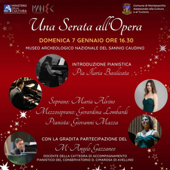 Domenica 7 gennaio alle 16.30 si terrà “Una Serata all’Opera”, con le più celebri arie del vasto repertorio operistico e cameristico italiano ed internazionale. Interverranno Pia Ilaria Basilicata (piano), Maria Alvino (soprano), Gerardina Lombardi (mezzosoprano), Giovanni Mazza (piano), con la gradita partecipazione del M° Angelo Gazzaneo, docente della cattedra di Accompagnamento pianistico del Conservatorio “D. Cimarosa” di Avellino.