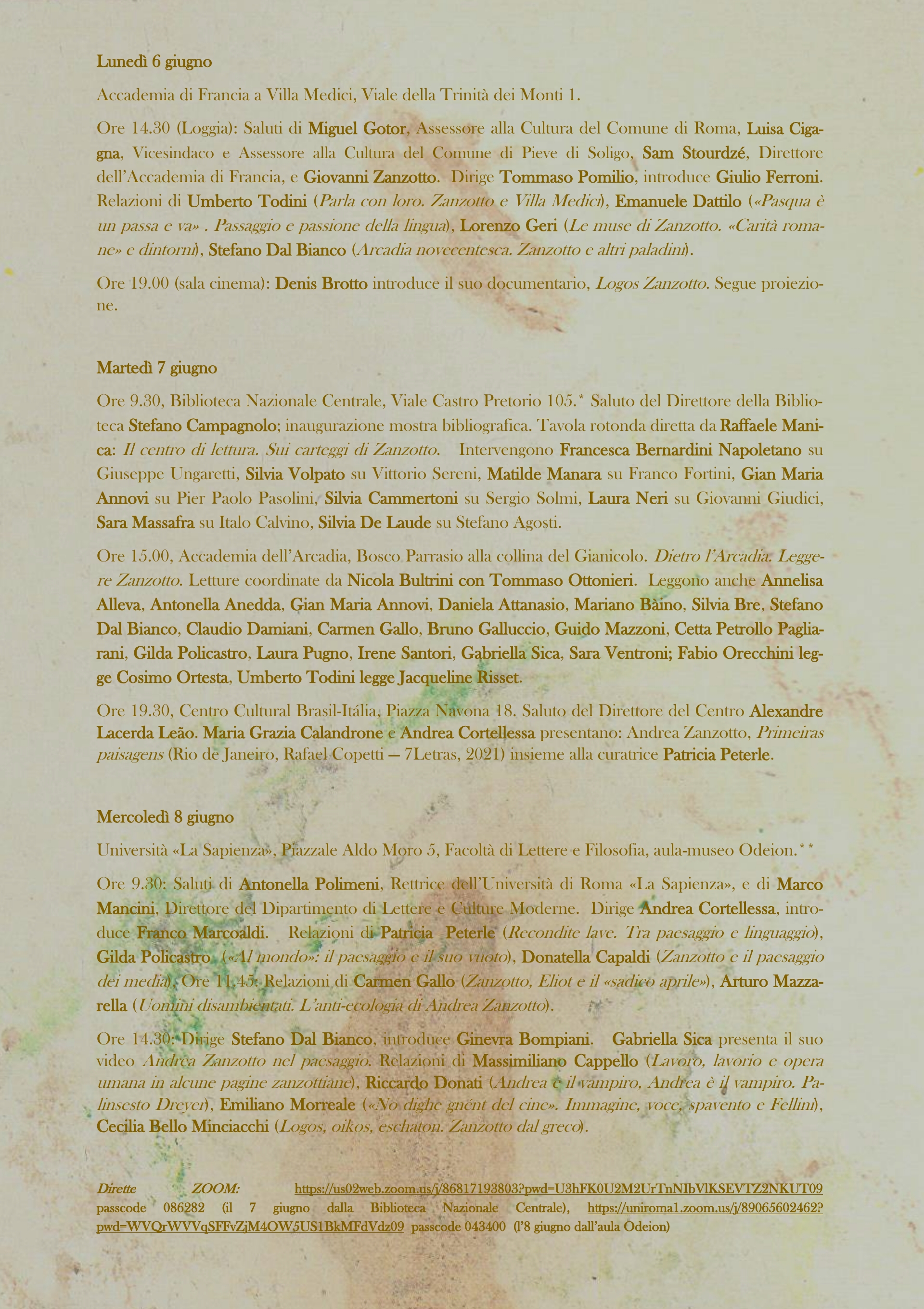 Il convegno verrà introdotto da un maestro della «Sapienza» e della Facoltà di Lettere, Giulio Ferroni, che al poeta fu legato da una profonda amicizia; e, specialmente nella prima tranche, sarà dedicato al rapporto di Zanzotto con Roma, il suo mito e la sua concreta stratificazione storica e letteraria.