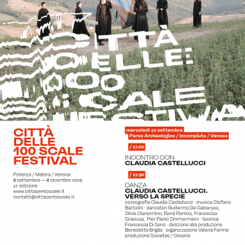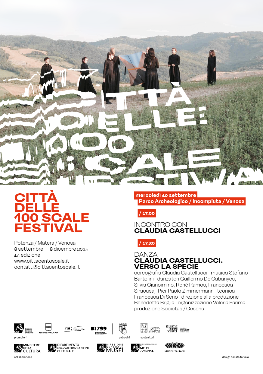 IL 10 settembre, nella Chiesa Incompiuta, nuovo imperdibile appuntamento con la danza, con lo spettacolo “Verso la specie” di Claudia Castellucci, organizzato nell’ambito del “Città delle 100 Scale Festival” in collaborazione con i Musei e Parchi Archeologici di Melfi e Venosa.