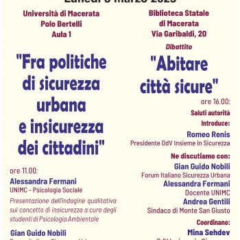 La Biblioteca Statale di Macerata in collaborazione con L’Associazione “Insieme in Sicurezza” e il Dipartimento di Scienze della Formazione dei Beni Culturali e del Turismo dell’Università di Macerata lunedì 3 marzo 2025 alle ore 16.00, organizza un incontro dibattito sul tema: “Abitare città sicure”. Introduce: Romeo Renis, intervengono: Gian Guido Nobili, Alessandra Fermani e Andrea Gentili, coordinano: Mina Sehdev e Lucia Nardi.