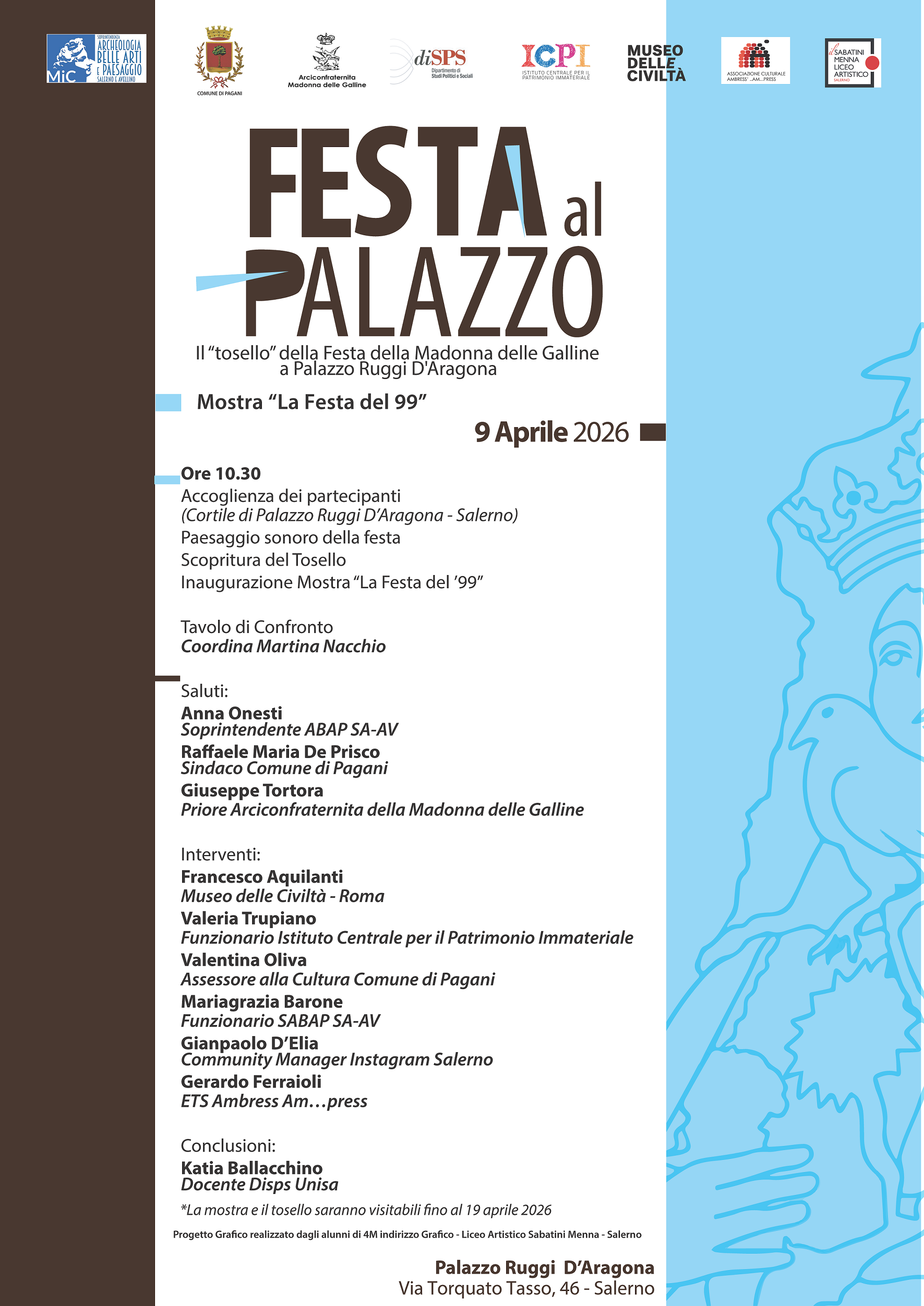 Significativa sarà anche la presenza del Liceo Artistico “Sabatini-Menna” di Salerno che, da tempo, partecipa attivamente a eventi ed iniziative promosse dalla Soprintendenza. In questa occasione, alcuni studenti hanno curato parte del progetto grafico, offrendo un supporto operativo concreto alla realizzazione dell’evento.