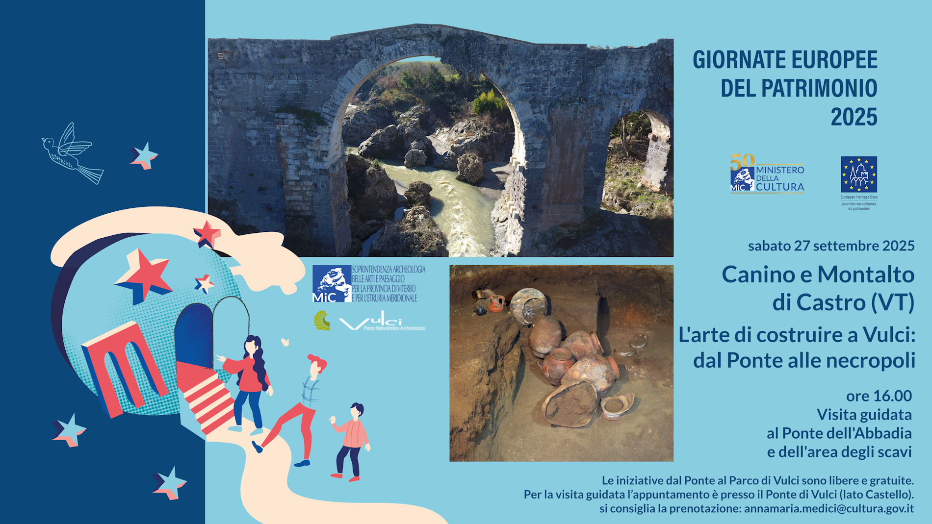 Tornano a Vulci le Giornate Europee del Patrimonio, dedicate, nell’edizione 2025, al tema: “Architetture: l’arte di costruire”. Il programma della giornata di sabato 27 settembre è rivolto a quanti vogliano conoscere in particolare le novità che scaturiscono dalle ricerche e dai progetti in corso presso l’antica città etrusca: