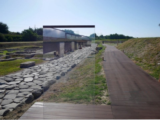 Lungo l’itinerario sono inserite lastre prospettiche serigrafate che propongono la ricostruzione in alzato dei magazzini e degli elementi architettonici non più presenti. Le riproduzioni grafiche si sovrappongono al panorama circostante, fondendosi e restituendo la vista del complesso come doveva essere nel V-VI secolo, facendo vivere al visitatore un’esperienza immersiva a tutto tondo.