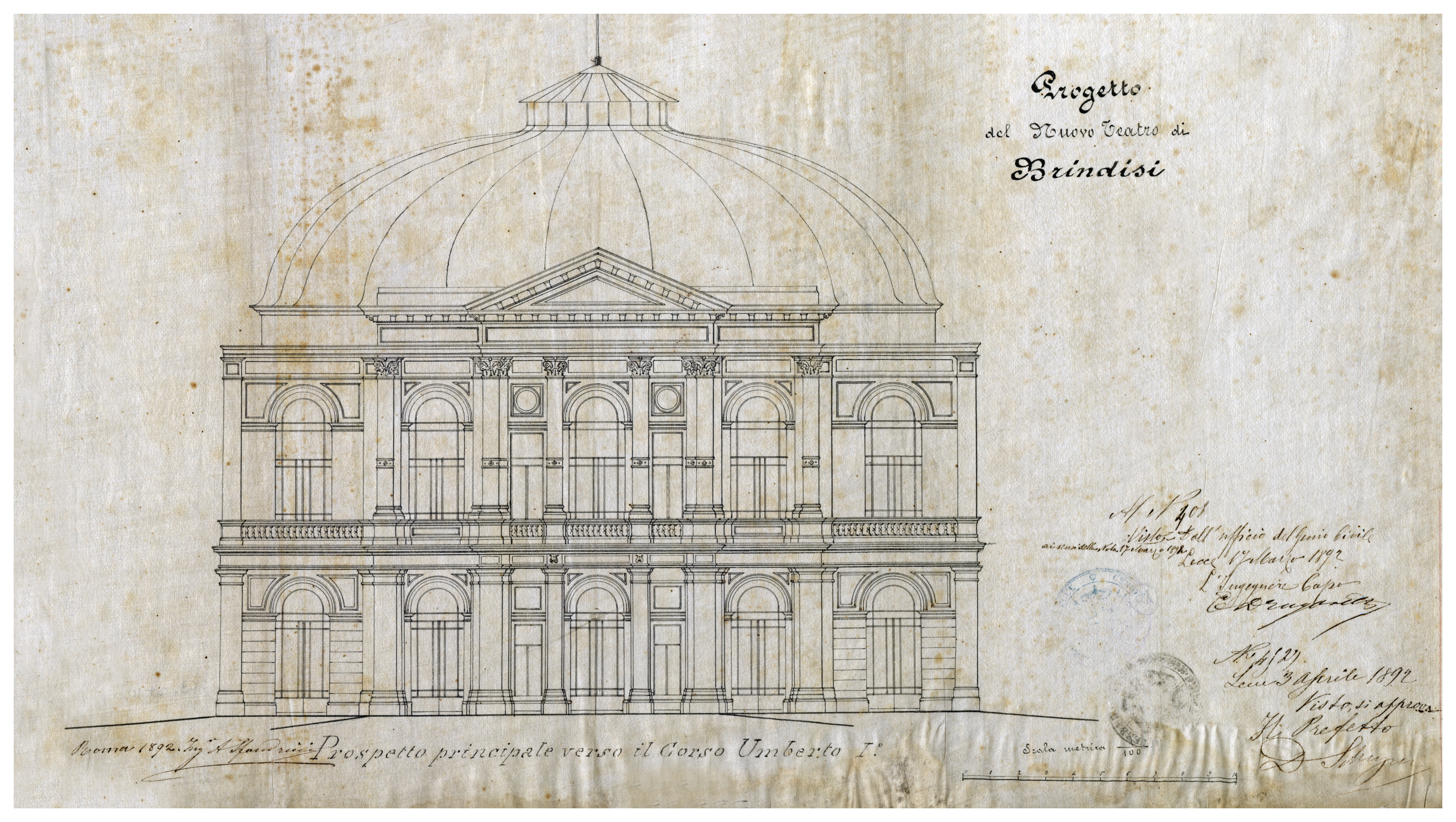 Progetto del prospetto principale dell'antico teatro Giuseppe Verdi di Brindisi realizzato da Achille Sfondrini (1892), fondo Archivio Storico del Comune di Brindisi