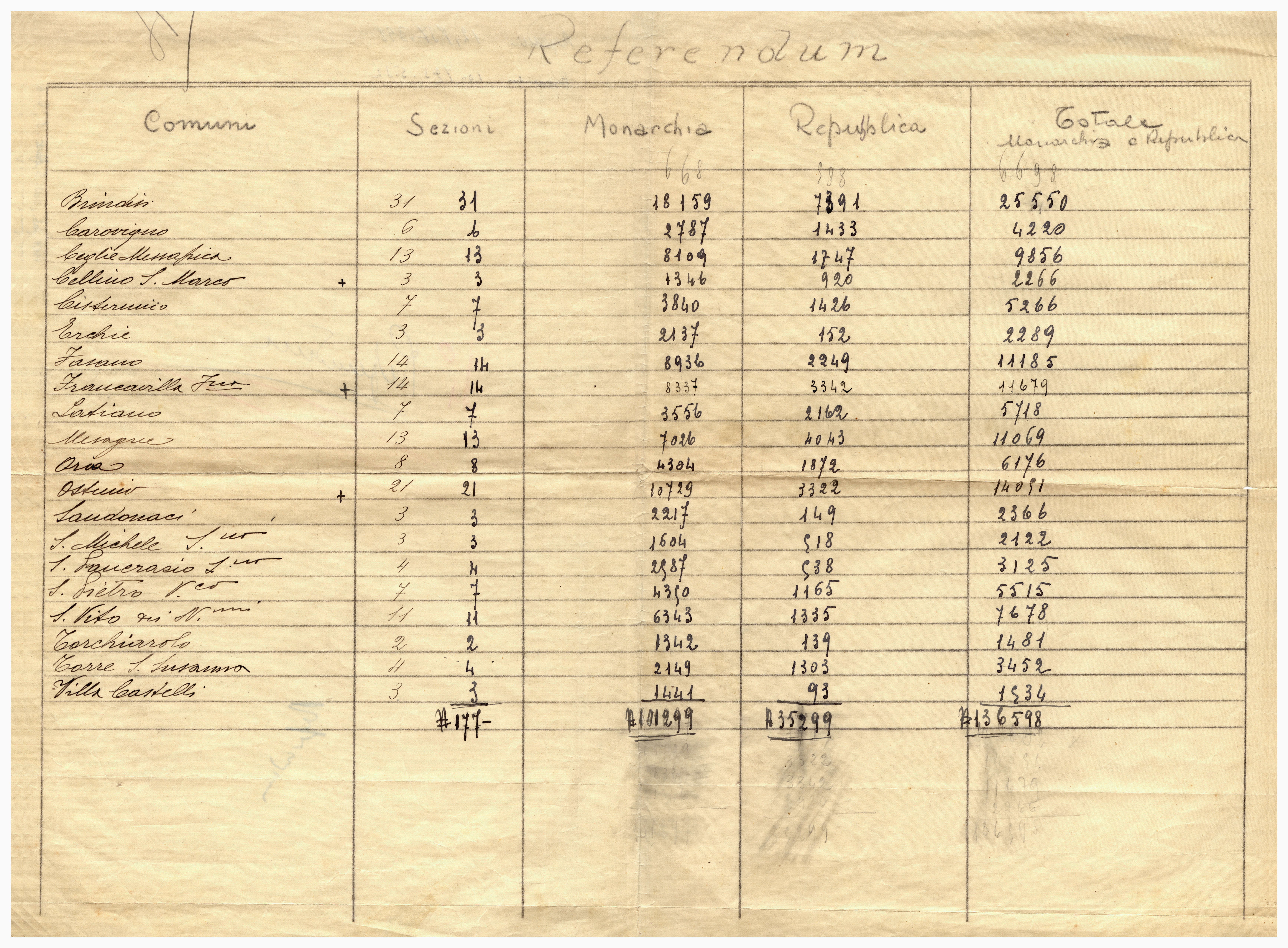 Risultati in provincia di Brindisi del referendum del 2 giugno 1946 sulla scelta tra monarchia e repubblica, fondo Prefettura