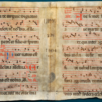 Frammento membranaceo con antifona della Messa del giorno di Natale, Italia - Seconda metà sec. XV. Bureau du domaine national et de l'enregistrement de Verceil, Antifonario, perg. A-12.