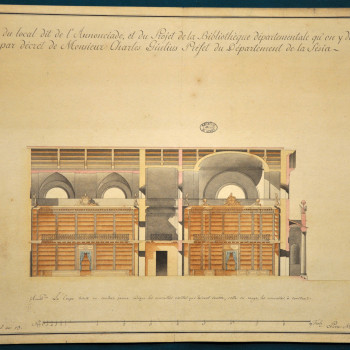 1805 marzo 26, Vercelli (Verceil 5. Germinal an: 13). Disegno del progetto per una Biblioteca da realizzare nel Monastero della Santissima Annunziata nella città di Vercelli in seguito alla soppressione napoleonica degli enti ecclesiastici. Dipartimento della Sesia, Disegni, Tavola I, 65.