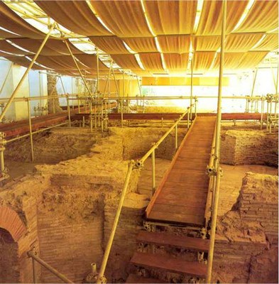 Il complesso termale, compreso all'interno del monastero trecentesco annesso alla chiesa di Santa Chiara, è sito in un'area che ricadeva al di fuori della cinta muraria, ad Ovest della porta urbica della città greco-romana. La scoperta dell’edificio e l’analisi di vecchi e nuovi rinvenimenti archeologici hanno chiarito come il luogo sia divenuto, già dal I secolo d.C., per rimanere tale almeno fino al IV secolo d.C., un quartiere residenziale con edifici a carattere pubblico. Inglobato nella cinta muraria a seguito dell'ampliamento del 440 d.C., il complesso conservò infatti la sua funzione termale sino all'età tardo antica, quando se ne affrontò una consistente ristrutturazione.