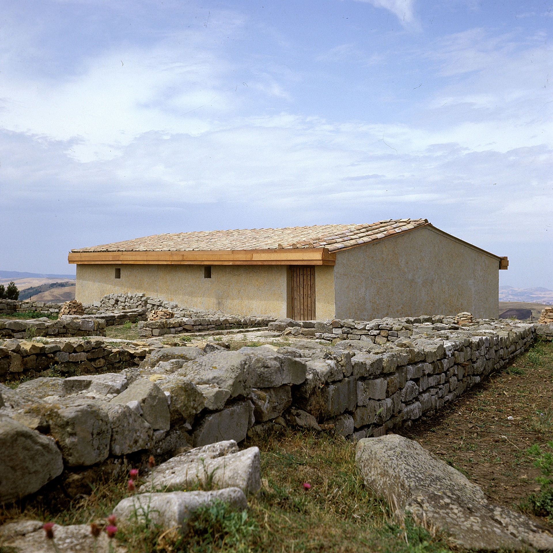 Frequentata già nel Bronzo Finale, l’area viene occupata stabilmente nella seconda metà dell’VIII a.C. da un insediamento costituito da più gruppi di capanne, con relative necropoli, forse organizzati per nuclei familiari. Una di queste capanne è ancora visibile al di sotto del pavimento di una struttura abitativa di V a.C., la cosiddetta “casa dei pithoi”: si tratta di una capanna di forma ovale, dal diametro di circa 8 metri, con pareti in pietrame a secco e pavimento in terra battuta con acciottolato.