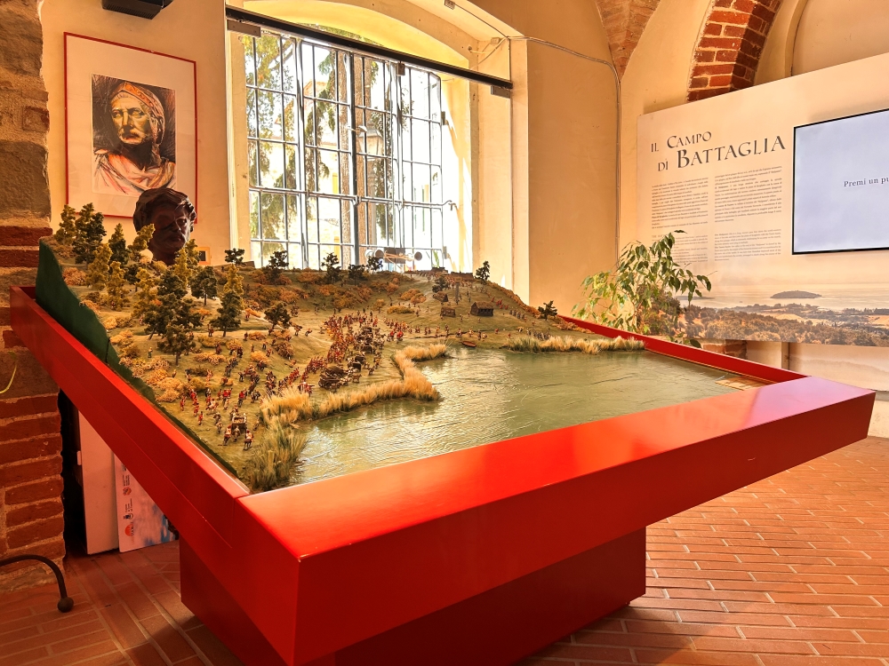 L’indomani, alle prime luci dell’alba, arrivarono gli inseguitori, 30.000 romani guidati dal console Gaio Flaminio, i quali erano inconsapevoli della presenza nemica – non avevano fatto una ricognizione – ed impreparati entrarono, incolonnati e rallentati dalle masserizie, nella vallata nebbia levatasi dal lago. L’eco del massacro ancora risuona in questi luoghi e nei loro nomi, e i viandanti di tutti i luoghi, le epoche e ceti sono passati a vedere uno dei pochi campi di battaglia della Roma repubblicana noti in tutta Europa. Questa grande affluenza ha indotto il Comune di Tuoro sul Trasimeno ad organizzare prima un itinerario suddiviso in 13 tappe attrezzate con pannelli che illustrano i diversi momenti della battaglia, le caratteristiche dei due eserciti e li loro armamenti. Quindi è stato approntato il Centro di Documentazione permanente su Annibale e la battaglia del Trasimeno, intitolato al Prof. Giancarlo Susini. E’ questo un museo multimediale sito nel palazzo di Piazza Garibaldi, composto da vari video che mostrano la ricostruzione della Battaglia del Trasimeno, così come dell’evoluzione delle teorie e degli studi su di essa, e gli altri principali scontri della seconda guerra punica. Touch screen, pannelli informativi, una piccola biblioteca completano il museo. Il centro è periodicamente sede di incontri, conferenze, dibattiti, presentazioni di pubblicazione e riviste sull’argomento.
