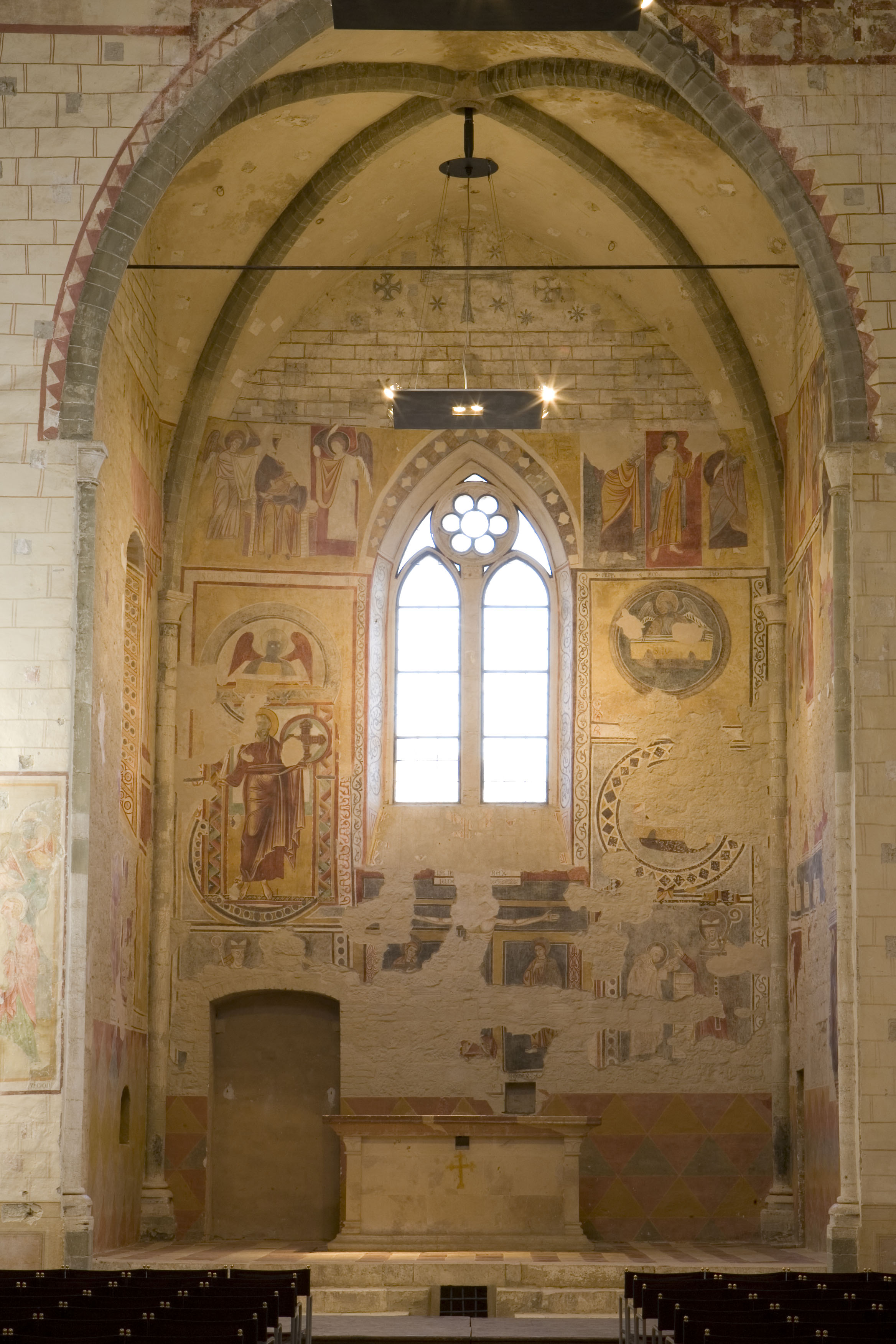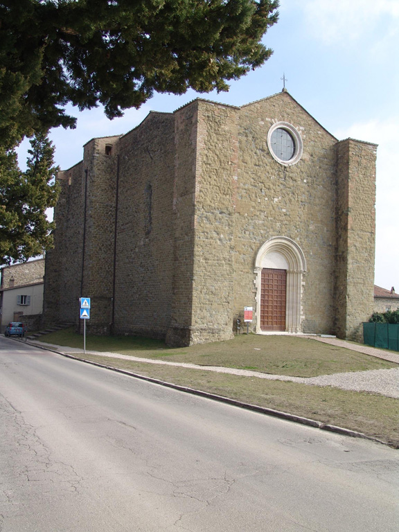 La chiesa si presenta esternamente disadorna secondo il modello di edifici fatti costruire dai templari in Palestina. All’interno, a navata unica con due campate coperte da crociera e abside quadrata rialzata introdotta da arco trionfale, conserva affreschi due-trecenteschi di grande importanza come la Processione dei flagellanti, la Lotta tra templari e mussulmani, la Leggenda di san Bevignate, sul mantello del quale figurano graffiti incisi tra la fine del XV e il XVI secolo da pellegrini, fedeli e cavalieri templari.