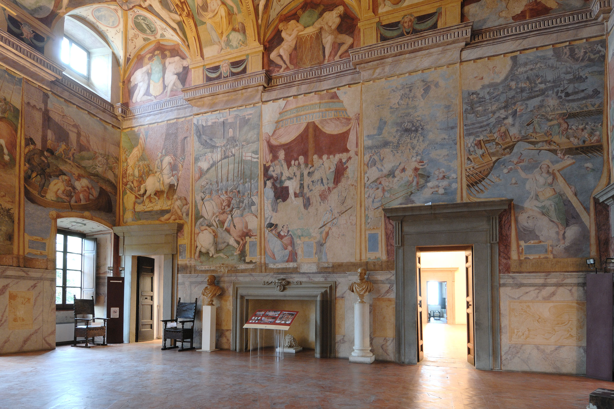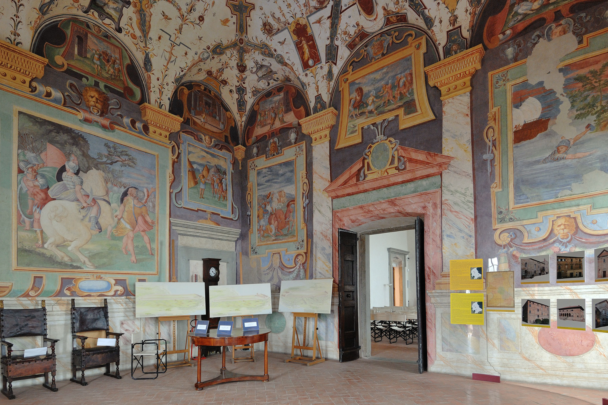 Emblema del potente marchesato della famiglia della Corgna, il palazzo venne fatto edificare a partire dalla metà del XVI secolo da Ascanio, maggiore esponente della famiglia e responsabile della sistemazione urbanistica del centro cit-tadino, di cui il palazzo è fulcro. Frutto di regolarizzazioni di precedenti proprietà della famiglia Baglioni, fu quindi ampliato e completato dai successori di Ascanio. Il ciclo di affreschi che ne adorna le sale è tra i più alti esempi di decorazione gentilizia in Umbria, teso ad esaltare le gesta di Ascanio, anche attraverso il ricorso a temi mitologici e a vicende legate al territorio del lago Trasimeno. La realizzazione venne affidata a Niccolò Circignani detto il Pomarancio da Diomede della Penna della Corgna, nipote di Ascanio, nel 1574. Tra i collaboratori emerge Giovanni Antonio Pandolfi, la cui mano è riconoscibile in alcune scene della sala dell’Eneide. La fortezza medievale, presidio perugino a controllo del lago Trasimeno, è collegata al palazzo attraverso un camminamento voluto dai della Corgna per rendere più agevole il passaggio in caso di attacchi.