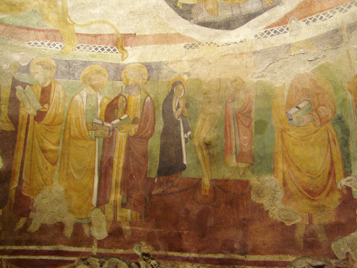 Le pareti, miste di pietra e mattoni, che compongono la conca absidale emisferica, presentano infatti degli affreschi di notevole interesse. Gli affreschi presenti nel fascione in basso rappresentano la teoria degli apostoli, con al centro una crocifissione.