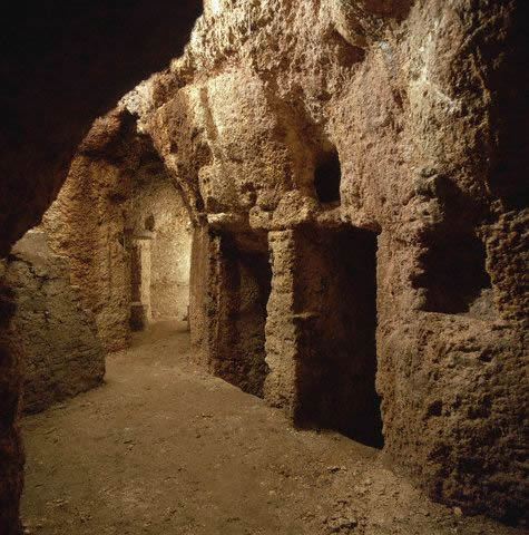 Una ripida scaletta immette nella camera centrale, dalla quale dipartono tre corridoi. Nelle pareti vi sono nicchie e grezzi bancali, ma il maggior mistero è rappresentato da tre rozzi mascheroni.
