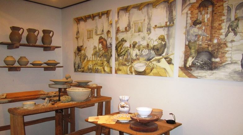 Grazie alla collaborazione di studiosi e dei singoli cittadini è nata l'attuale mostra delle maioliche mondainesi, che raccoglie i reperti ceramici, esposti secondo una logica cronologica, che invita l'utente a ripercorrere la storia delle ceramiche di Mondaino. A supporto dei pannelli che trattano le fasi della fabbricazione delle ceramiche, è presente una grande nicchia-vetrina che contiene una accurata riproduzione di quello che doveva essere un laboratorio di ceramica cinquecentesco. (Fonte dal sito internet)