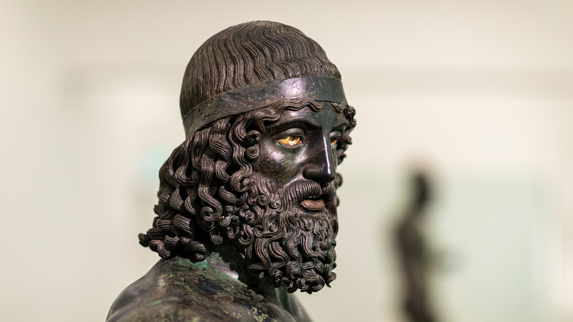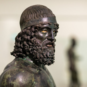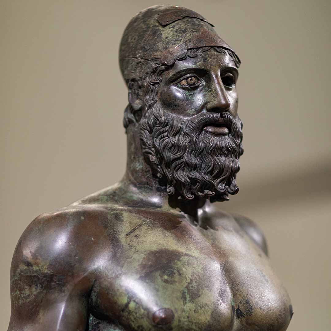 Celebri eccellenze della bronzistica greca del V secolo a.C., i Bronzi di Riace costituiscono il simbolo del Museo Archeologico Nazionale di Reggio Calabria, nonché l’icona identitaria della città stessa. Scoperte il 16 agosto 1972 sui fondali marini di fronte al borgo di Riace, le due statue vengono convenzionalmente definite Bronzo A e Bronzo B e raffigurano guerrieri stanti, di dimensioni poco superiori al vero: alte rispettivamente 1,98 e 1,97 metri, entrambe mostrano uomini nudi, atletici e barbati, che in origine erano raffigurati con armi. Entrambi i personaggi sono rappresentati secondo il medesimo schema: il peso del corpo è sostenuto dalla gamba destra, mentre la sinistra, libera, è leggermente aperta verso l’esterno; il braccio destro è teso lungo il fianco, con la mano che doveva stringere una lunga lancia; il braccio sinistro, invece, è piegato in avanti e doveva originariamente reggere lo scudo; sul capo, infine, entrambi dovevano indossare un elmo, sollevato sulla fronte. La loro nudità ha un significato culturalmente rilevante: per i Greci, infatti, la rappresentazione di un corpo maschile perfetto simboleggiava il valore fisico e morale dell’uomo, nel suo ruolo di cittadino, atleta e soldato.