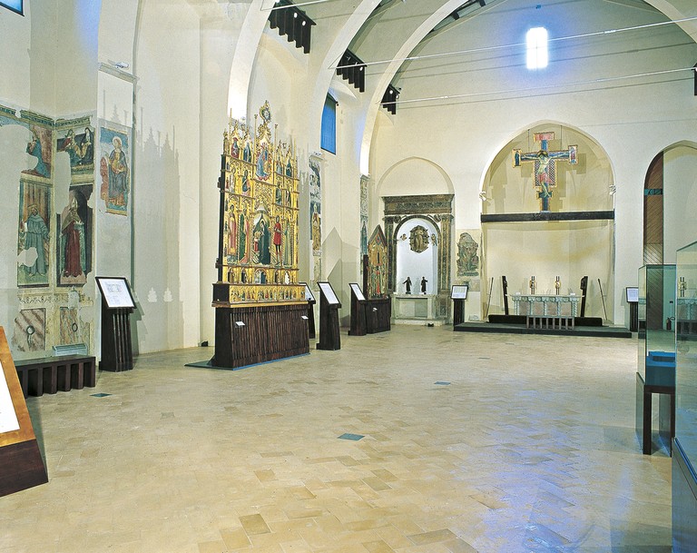 Riaperto nel 2003, dopo interventi dovuti all’evento sismico del 1997, il museo è allestito all’interno dell’ex chiesa di San Francesco. Edificata a partire dal XIII secolo, fu successivamente ampliata e decorata da una serie di affreschi del Quattrocento e del primo Cinquecento, molti dei quali ascrivibili a Matteo da Gualdo(San Francesco riceve le stimmate, Madonna col Bambino, Annunciazione) e alla sua cerchia.La struttura conserva opere mobili di particolare rilievo come la Croce sagomata della seconda metà del XIII, proveniente dall’antica chiesa di San Francesco, il grande polittico di Niccolò di Liberatore detto l’Alunno eseguito nel 1483 per l’altare maggiore del duomo della città e l’Incontro tra Gioacchino e Anna alla Porta Aurea di Matteo da Gualdo.