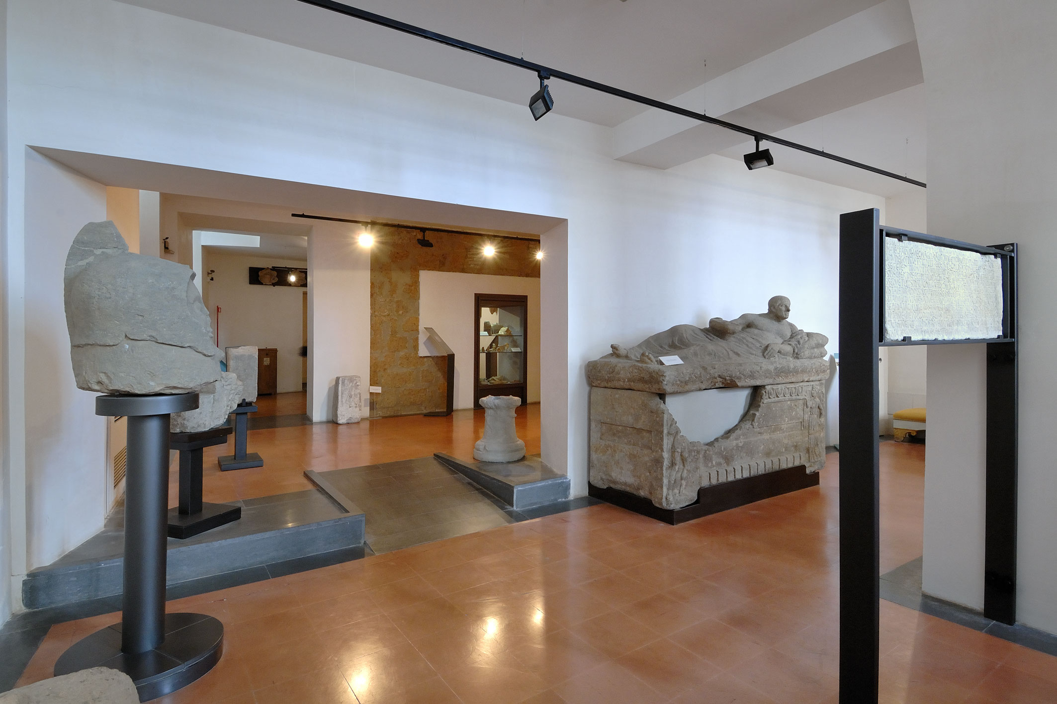 Dalla galleria situata al secondo piano del palazzo si può ammirare una prospettiva particolare del Duomo. Dall’ingresso in piazza Duomo si accede al Museo Civico archeologico, sistemato al piano terra del palazzo, interamente dedicato ai reperti provenienti dagli scavi della città e del territorio d’Orvieto, che testimoniano l’eccezionale fioritura di Volsinii, l’etrusca Orvieto. Delle produzioni di altissima qualità artistica realizzate nel corso del V secolo a.C. dalle botteghe volsiniesi sono esposte le terrecotte architettoniche provenienti dal tempio del Belvedere. Ispirati direttamente all’arte classica greca, costituivano l’apparato decorativo e di rivestimento degli edifici sacri. Dall’area sacra di Cannicella, complesso santuariale all’interno della necropoli posta a sud della città, proviene la celebre statuetta della Venere, e della necropoli del Crocifisso del Tufo sono esposti alcuni cippi in pietra, i segnacoli delle tombe in genere recanti il nome del defunto. Del territorio orvietano sono illustrati materiali collezionati nel corso dell’Ottocento, tra cui il sarcofago di Torre San Severo, con scene scolpite raffiguranti episodi mediati dalla mitologia greca, di ispirazione funeraria.