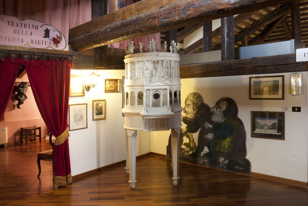 La Lanterna Magica è un apparecchio ottico inventato a metà del Seicento, adatto a proiettare su uno schermo piccole immagini dipinte o foto su vetro, ottenendone l’ingrandimento. I vetri da proiezione, vere miniature, possono essere fissi o animati da piccoli e complicati meccanismi. Le serie dedicate all’Astrologia, ai personaggi buffi del Circo, alle apparizioni fantastiche, alle dissolvenze dal giorno alla notte, ai racconti moraleggianti, alle aurore boreali del Polo Nord, alle favole e leggende, presentano i soggetti iconografici di maggior successo del Settecento e dell’Ottocento. La serie dedicata al Grand Tour ci conduce sulle orme del viaggio di formazione che i giovani rampolli delle famiglie nobili europee compivano attraverso l’Europa dell’epoca.