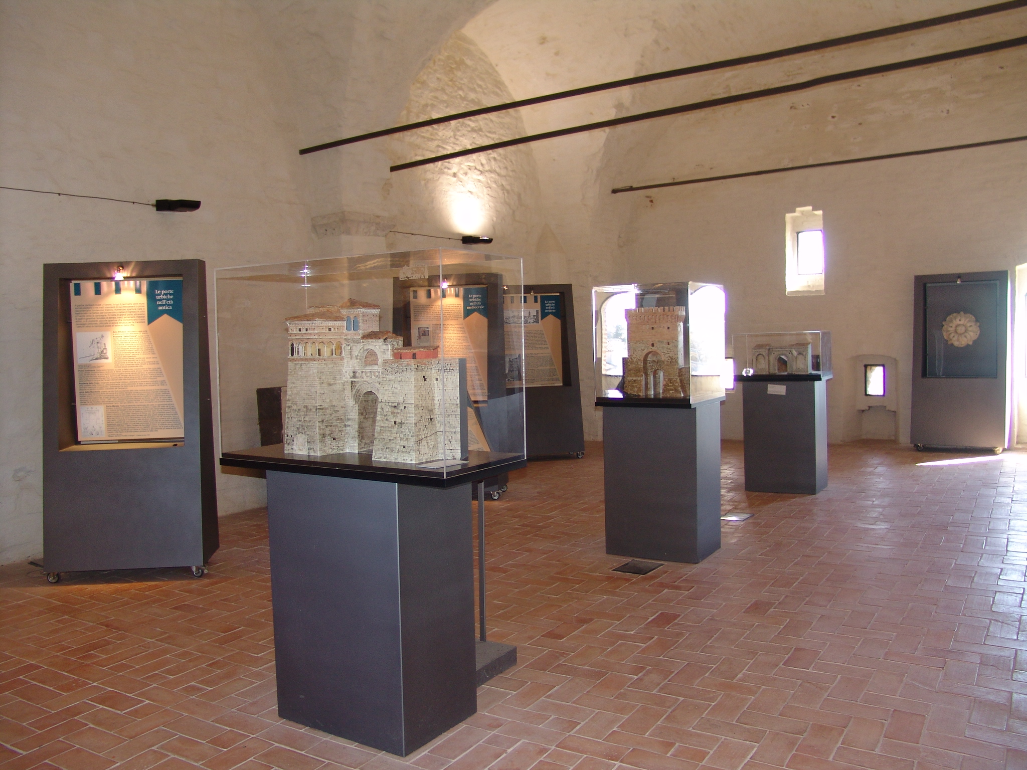 Al piano superiore vi sono riproduzioni delle principali porte per ciascuna fase di espansione della cinta, il modellino in scala dell'Arco etrusco, del Cassero di porta Sant'Angelo e della rinascimentale Porta San Pietro decorata dai bassorilievi di Agostino di Duccio.