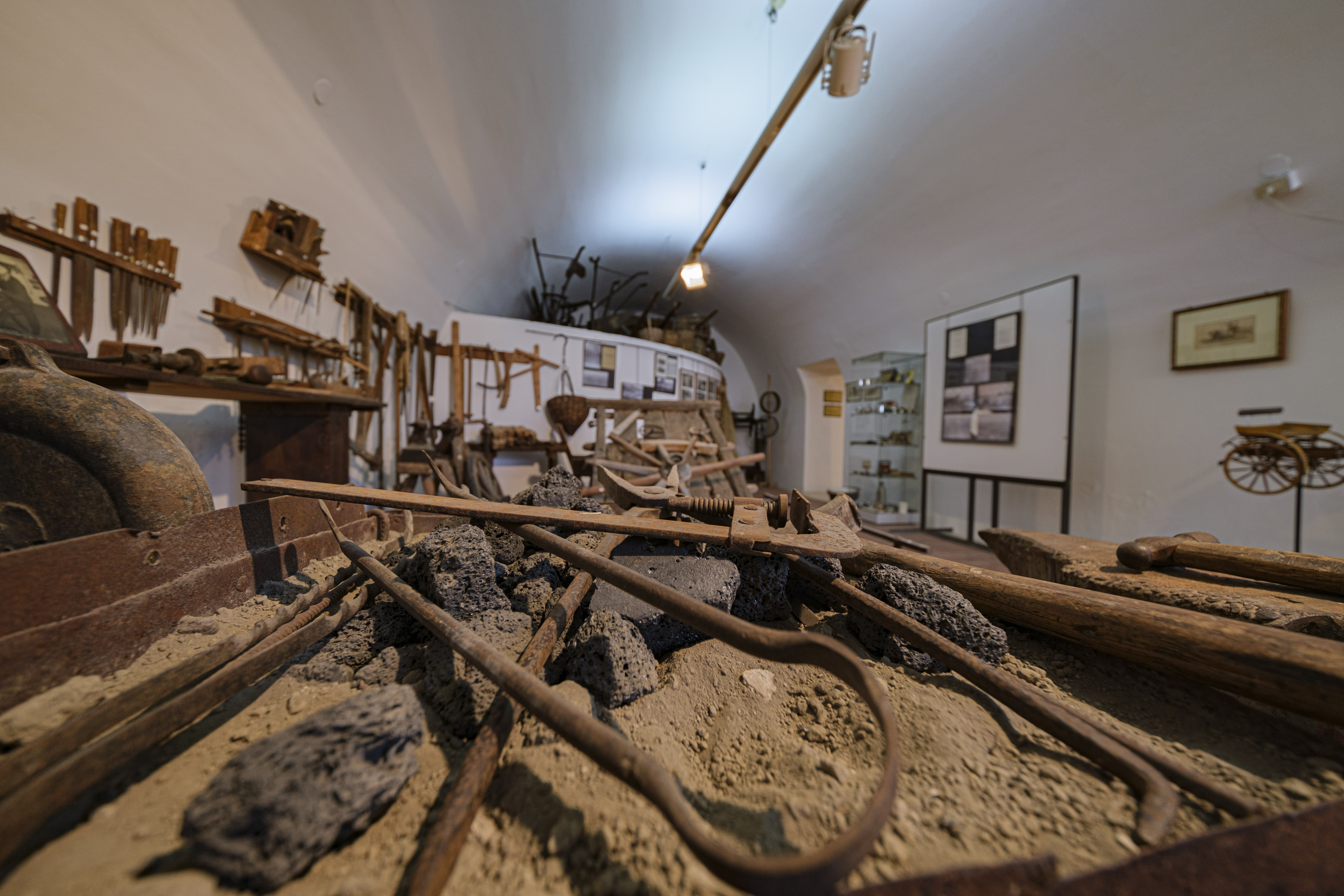 Nelle sale trova spazio, accanto agli strumenti del lavoro agricolo, anche la ricostruzione degli ambienti domestici in cui gran parte della vita si svolgeva. In questo contesto culturale e in questa dimensione agraria nasceva Pulcinella: la maschera non cittadina, la maschera del buffo e stolto campagnuolo. Sin dal 1500, infatti, Pulcinella e Acerra erano diventati un binomio indissolubile. Per alcuni Puccio D’Aniello, Paolo Cinella, o un tal Paoluccio della Cerra, dipinto da Ludovico Carracci, furono quei personaggi che diedero corpo e anima al primo Pulcinella. Per altri, invece, fu uno Zanni Policiniello, piccolo pulcino, con la voce resa roca dalla pivetta o dall’uso della maschera, il grande e primo Pulcinella. Per altri ancora, la maschera acerrana rappresenta l’ultimo erede di Maccus il personaggio più buffo e sciocco delle Fabulae Atellanae, rappresentate nel Teatro Romano di Acerrae, sui cui resti, visitabili nel Museo Archeologico, fu costruito lo stesso Castello.