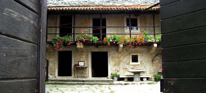 Il tetto, sormontato da un imponente camino, presenta una caratteristica copertura in lastre di pietra. In pietra squadrata sono anche la soglia e le finestre. Davanti alla casa un suggestivo cortile con pozzo. Tutt'attorno mura di pietra a protezione del cortile e della casa.