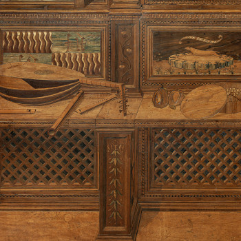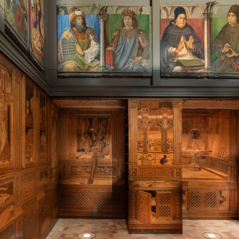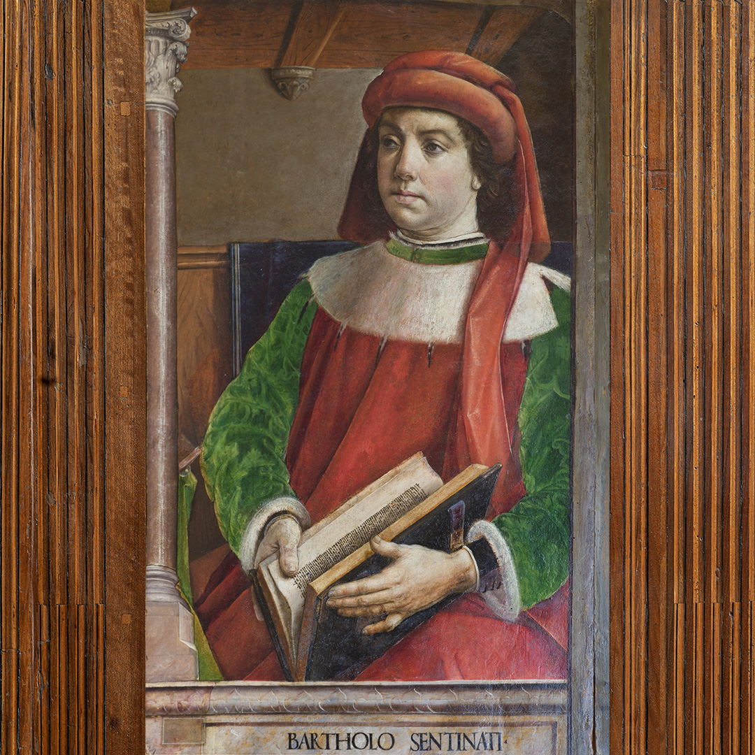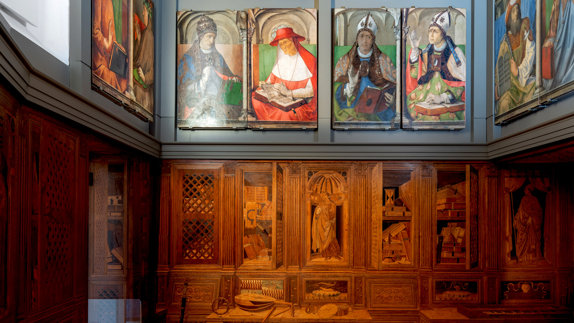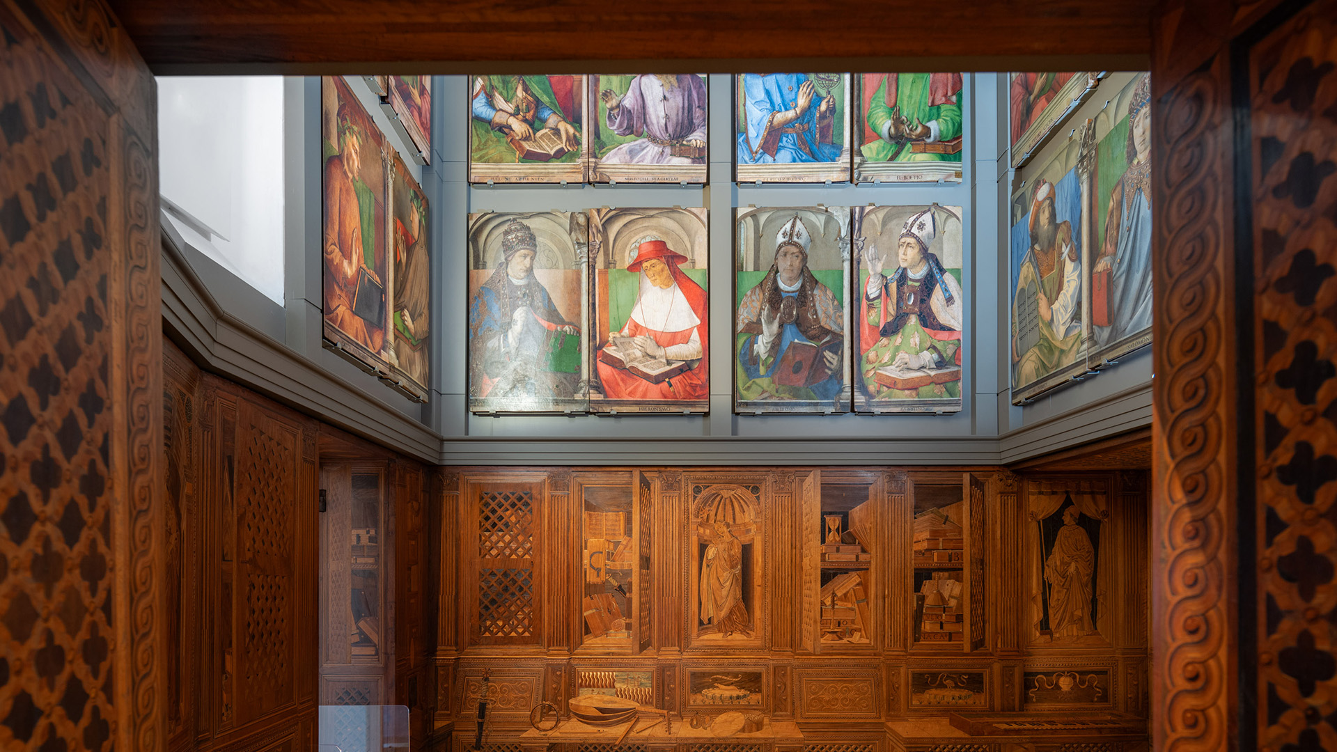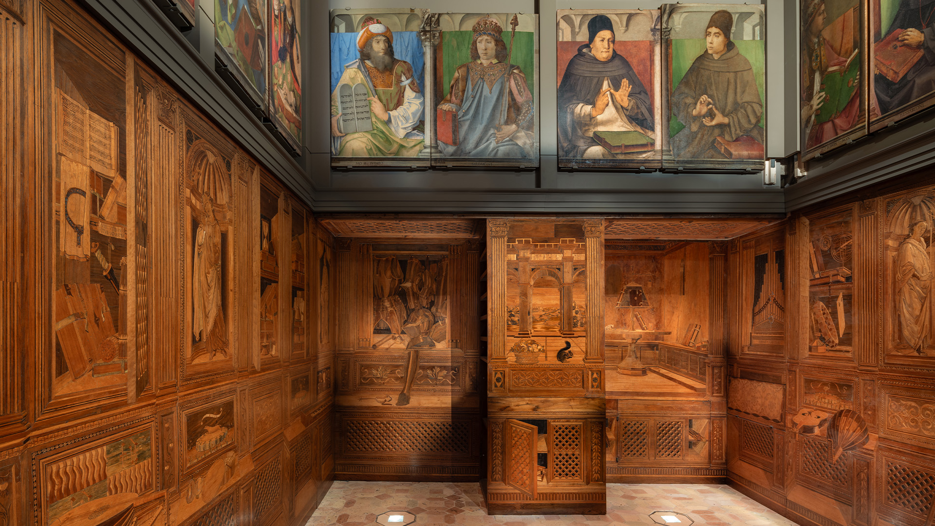Concepito come luogo di studio e di meditazione, lo Studiolo del Duca è un piccolo preziosissimo ambiente quasi nascosto nel cuore dell’appartamento padronale del Palazzo Ducale di Urbino. Il ricco apparato decorativo è stato concepito come una sorta di ritratto intellettuale e morale del committente Federico da Montefeltro. Già dall’ingresso, in origine sormontato dal doppio ritratto opera di Pedro Berruguete, Federico – assieme al figlio Guidubaldo – esibisce una sintesi delle sue qualità. Uomo d’armi e di lettere, benché vestito dell’armatura appare intento a leggere un libro ed è ornato delle onorificenze degli ordini dell’ermellino e della giarrettiera, che troveremo ripetuti anche nelle tarsie all’interno dello studiolo. La data riportata nel fregio del soffitto, all’interno della stanza, riporta la data conclusiva dei lavori, il 1476. Entro quell’anno, nella bottega fiorentina di Giuliano e Benedetto da Maiano, vennero realizzate le preziose tarsie, mentre i grandi pannelli dipinti raffiguranti i ventotto Uomini Illustri, furono affidati, in Urbino, al fiammingo Giusto di Gand e poi completati dal Berruguete. Di tutti loro Federico possedeva gli scritti nella sua ricca biblioteca. Le tarsie, raffigurano scansie semiaperte sui ripiani delle quali sono sparsi – in apparente disordine – armi, libri e spartiti, strumenti musicali e matematici, mentre finte nicchie ospitano, le allegorie delle Virtù teologali (Speranza, Fede e Carità) e un ritratto dello stesso Federico. Sotto di esse, in una fascia divisa in riquadri, sono rappresentate le imprese araldiche personali del Duca, che traducono in un sistema di simboli le sue qualità morali. A questo manifesto della cultura del signore di Urbino si unisce un gusto raffinato per il gioco arguto, che trasforma la realtà. Il realismo di stoffe e gioielli dipinti dei ritratti, in alto, e l’illusione della prospettiva delle tarsie, in basso, conducono l’osservatore in uno spazio intimo ed irreale dove nulla è come sembra.