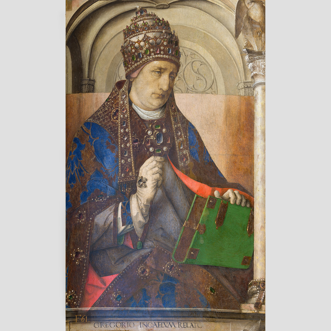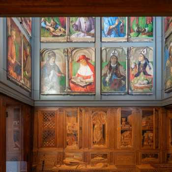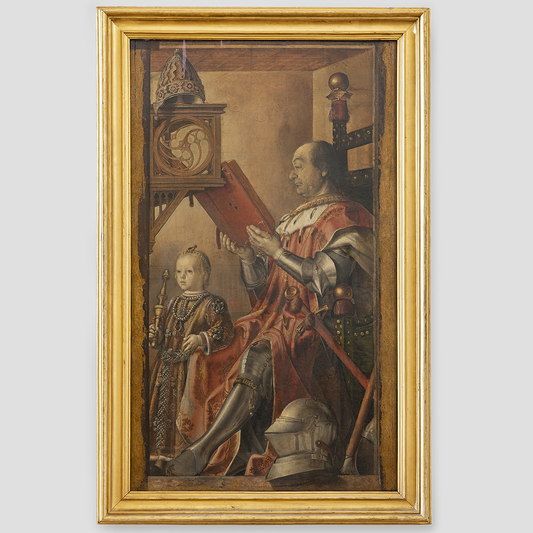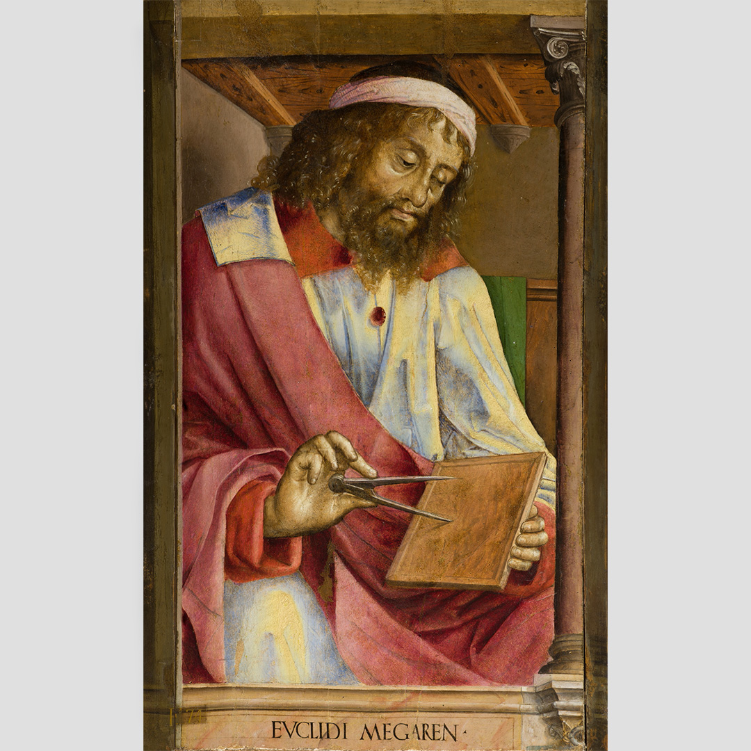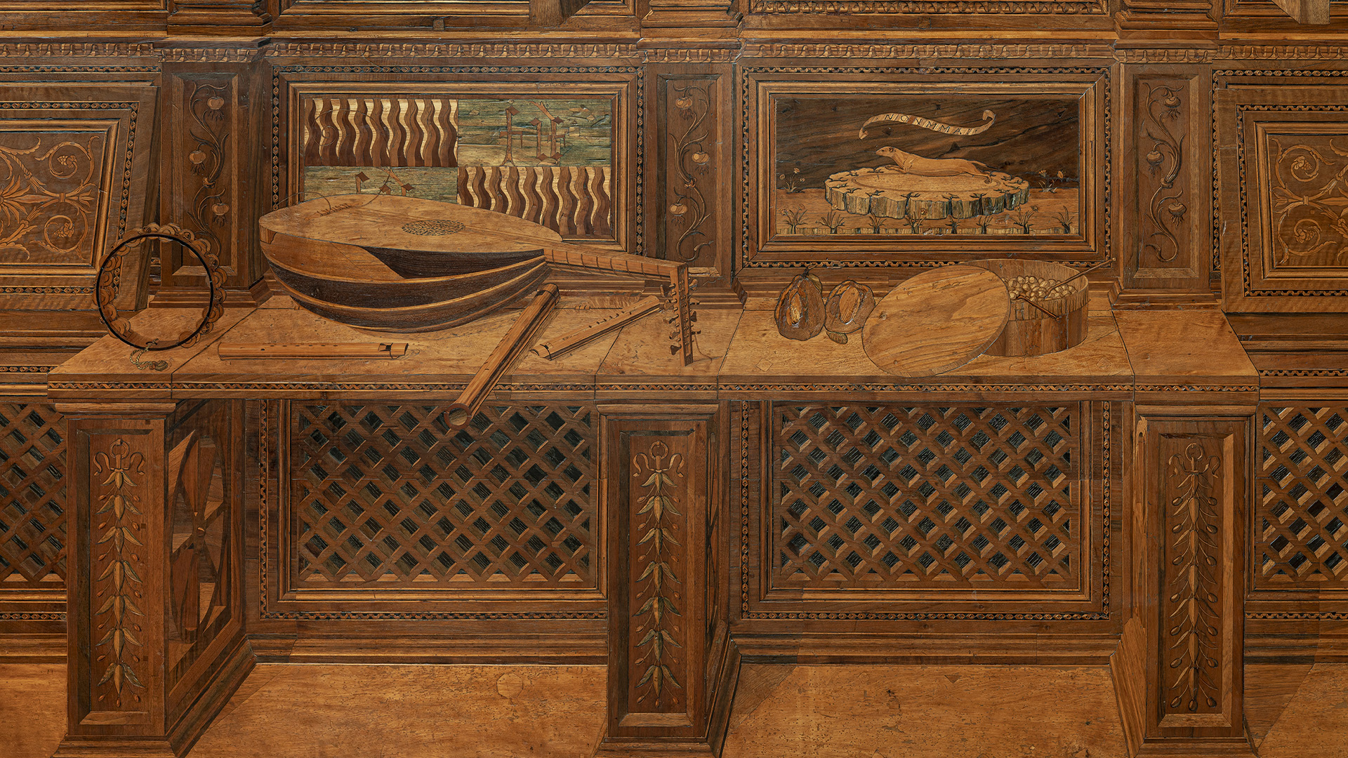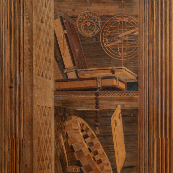 Concepito come luogo di studio e di meditazione, lo Studiolo del Duca è un piccolo preziosissimo ambiente quasi nascosto nel cuore dell’appartamento padronale del Palazzo Ducale di Urbino. Il ricco apparato decorativo è stato concepito come una sorta di ritratto intellettuale e morale del committente Federico da Montefeltro. Già dall’ingresso, in origine sormontato dal doppio ritratto opera di Pedro Berruguete, Federico – assieme al figlio Guidubaldo – esibisce una sintesi delle sue qualità. Uomo d’armi e di lettere, benché vestito dell’armatura appare intento a leggere un libro ed è ornato delle onorificenze degli ordini dell’ermellino e della giarrettiera, che troveremo ripetuti anche nelle tarsie all’interno dello studiolo. La data riportata nel fregio del soffitto, all’interno della stanza, riporta la data conclusiva dei lavori, il 1476. Entro quell’anno, nella bottega fiorentina di Giuliano e Benedetto da Maiano, vennero realizzate le preziose tarsie, mentre i grandi pannelli dipinti raffiguranti i ventotto Uomini Illustri, furono affidati, in Urbino, al fiammingo Giusto di Gand e poi completati dal Berruguete. Di tutti loro Federico possedeva gli scritti nella sua ricca biblioteca. Le tarsie, raffigurano scansie semiaperte sui ripiani delle quali sono sparsi – in apparente disordine – armi, libri e spartiti, strumenti musicali e matematici, mentre finte nicchie ospitano, le allegorie delle Virtù teologali (Speranza, Fede e Carità) e un ritratto dello stesso Federico. Sotto di esse, in una fascia divisa in riquadri, sono rappresentate le imprese araldiche personali del Duca, che traducono in un sistema di simboli le sue qualità morali. A questo manifesto della cultura del signore di Urbino si unisce un gusto raffinato per il gioco arguto, che trasforma la realtà. Il realismo di stoffe e gioielli dipinti dei ritratti, in alto, e l’illusione della prospettiva delle tarsie, in basso, conducono l’osservatore in uno spazio intimo ed irreale dove nulla è come sembra.