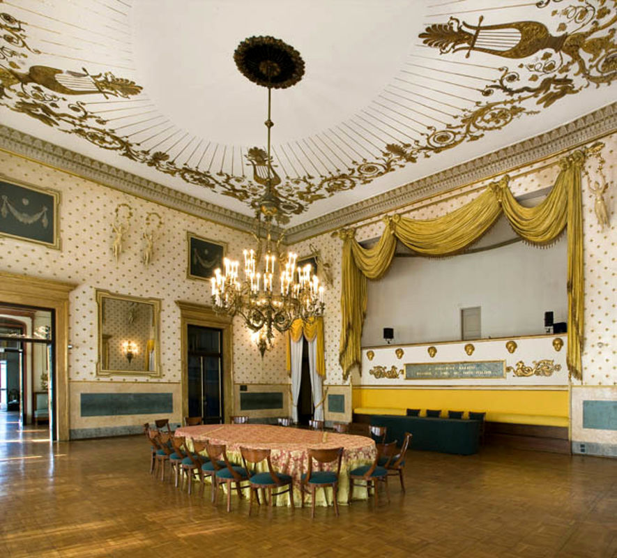 Il piano superiore fu aperto nel 1842, in occasione del Quarto Congresso degli Scienziati Italiani e fu concepito per ricoprire la funzione di ridotto. Il suo solenne ingresso è posto in una delle due logge; lo spazio si apre con uno scalone d’onore che si conclude in un nicchione decorato a stucco con l’immagine di Muse danzanti. Tutte le sale ruotano intorno alla sala da ballo dedicata a Gioacchino Rossini, grande vano doppio in altezza rispetto agli altri, dall’abbagliante decorazione impero, tutta inneggiante alla musica. Continuazione del vestibolo etrusco, e parallela a questa, è la sala greca, decorata da un affresco di Giovanni De Min rappresentante l’incontro tra Diogene e Platone. Segue un piccolo ambiente a pianta circolare, la sala romana, decorata nel 1841 dal bellunese Ippolito Caffi con vedute romane: Castel S. Angelo, il Foro romano e quello di Augusto, la Colonna Traiana, forse le pitture più interessanti dell’intero complesso.