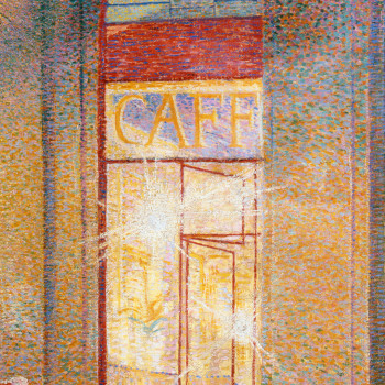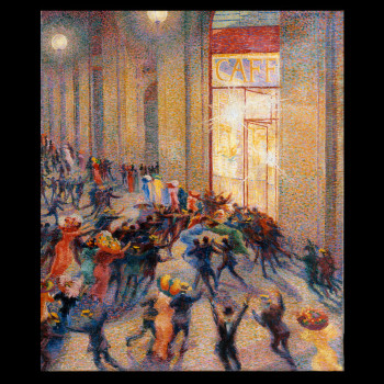 Datato 1910, poco dopo la firma dei due “Manifesti” sulla pittura di cui Boccioni diviene uno dei maggiori interpreti e teorici (Manifesto dei pittori futuristi; La pittura futurista. Manifesto tecnico), riproduce un episodio della vita notturna milanese: una rissa nella Galleria Vittorio Emanuele, fra alcuni cittadini, circondati dall’affollarsi dei passanti accorsi verso l’alta vetrata scintillante del “CAFFE’”. Prendendo spunto da un fatto di cronaca l’artista sperimenta luce e movimento in chiave futurista; da un lato riproduce i gesti concitati di lottatori e cittadini curiosi, dall’altro celebra l’invenzione più importante dell’epoca: l’elettricità. Affascinato dai principi di dinamismo, velocità, energia, progresso, l’artista utilizza la scomposizione cromatica divisionista e accosta colori primari, tracciati con piccole pennellate quasi puntiniste, in forte contrasto e sensibile opposizione con le zone in ombra; l’atmosfera vivace e scintillante della galleria ne appare quindi permeata da un vorticoso turbinio di luci e di frammenti di colore, che creano quella straordinaria impressione di movimento in atto.