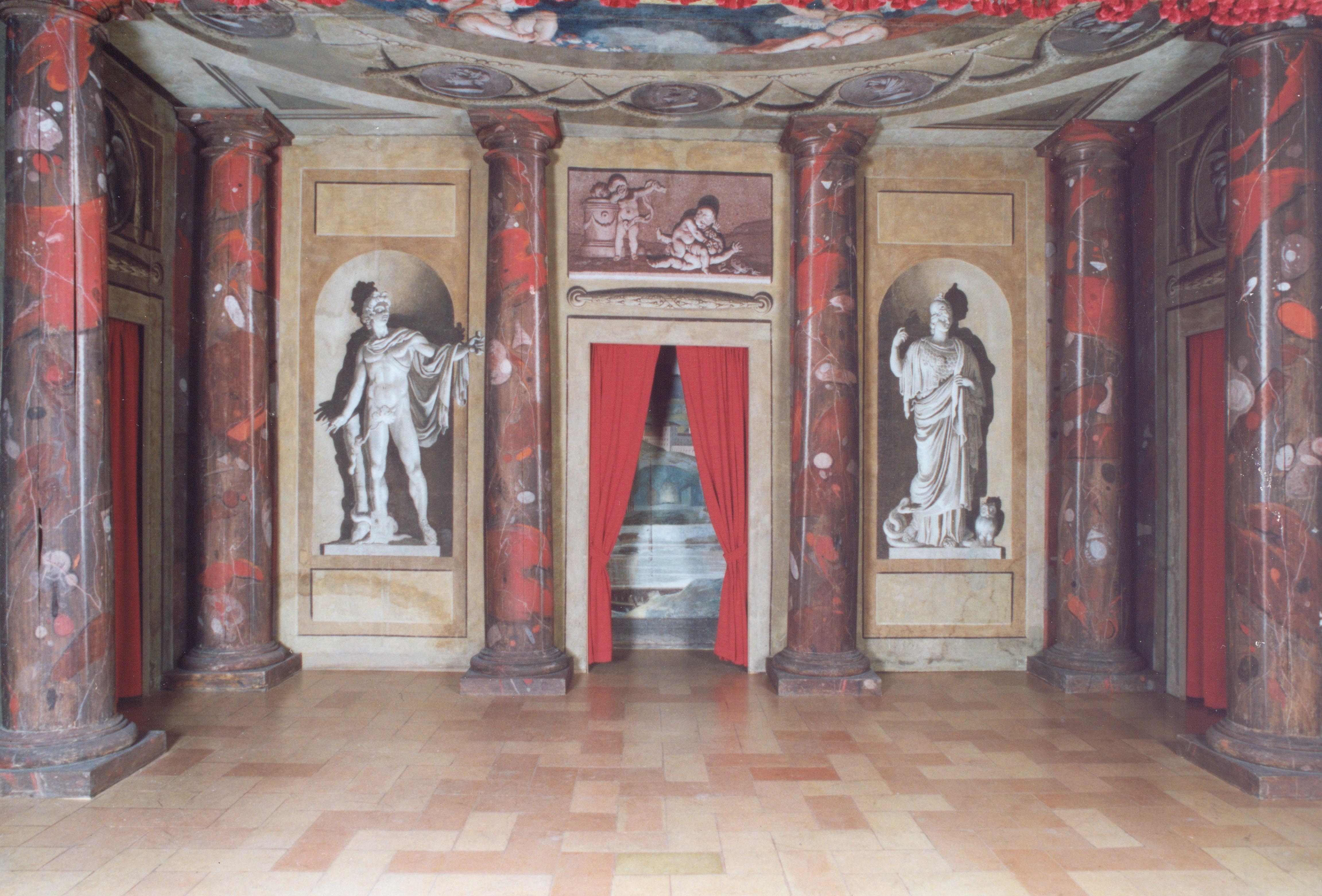 Ricavato nella soffitta, in una stanza rettangolare di non grandi dimensioni, ha un palcoscenico incorniciato da due pilastri mentre lo scenario è tripartito da quattro colonne doriche di legno dipinte a finto marmo che lateralmente inquadrano i bei monocromi con le statue di Apollo e Minerva. Tali monocromi risultano dipinti su due ante che, rimosse, aprono lo sguardo su un paesaggio con veduta di città (realizzato sul muro di fondo). Un fregio con putti completa, nella parte alta, lo scenario. Particolarmente interessante e di elevata qualità pittorica è il plafone in cui si finge un velario intorno al quale s'intrecciano puttini, ghirlande e festoni. La sala, arredata con le panche lignee originali e con i mobiletti per il buffet, è illuminata da tre finestre di cui due si affacciano sul giardino parzialmente tracciato a labirinto secondo l'antico schema.