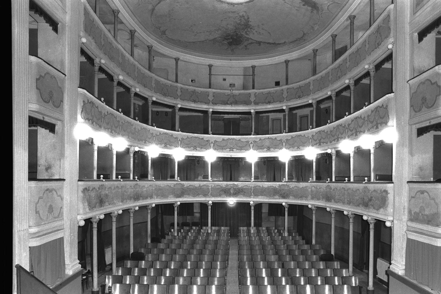 E' situato nel Palazzo Bentivoglio nell'ala sinistra a fianco dell'ingresso principale. Nel 1775 quando già il Palazzo era proprietà del Comune, si decise di emanare una delibera per la costruzione di un teatro con l'intento di impiegare la gioventù in onesti divertimenti, e per istruirla e renderla vantaggiosa e liberarla dall'ozio in certi tempi dell'anno, e far nascere in questa una profittevole emulazione, (p. 20) come cita il Cuppini nel suo studio per il recupero nel Palazzo Bentivoglio. Il progetto fu affidato all'architetto G.B.Fattori che ne fece un teatro finito in legno di stile barocco prospiciente allo scalone principale. Nel 1905 si iniziarono opere di rifacimento ed ampliamento dello stesso su iniziativa e fondi di una Società Teatrale costituita con l'intento di gestirlo per la durata di novantanove anni. Progettista e tecnico dei lavori fu nominato il geometra Vittorio Mazzoli, le decorazioni affidate a Villa di Reggio Emilia. I lavori si protrassero sino al 1907 e nell'Ottobre di quell'anno si aprì la prima stagione teatrale con la rappresentazione de I Pagliacci di Ruggero Leoncavallo e la Cavalleria Rusticana di Pietro Mascagni. La sala venne completamente ristrutturata adottando una struttura in ghisa: furono fatti due ordini di palchi ed una galleria sostenuti da colonnine, lo scalone marmoreo eliminato per rendere più spazioso il palcoscenico e si aprirono due porte ad arco sulla facciata del Palazzo. Il teatro ebbe un grande successo e dai paesi vicini accorreva un folto pubblico per assistere alle rappresentazioni operettistiche perché la qualità degli spettacoli risultava assai elevata dal punto di vista dell'allestimento e dell'esecuzione lirico-musicale (p. 141). Il maggior successo fu raggiunto nel 1919, 1920 e 1923 con ben undici repliche delle opere eseguite: Bohème, Andrea Chenier e Tosca. Nel 1936, la stagione lirica terminò e si chiuse con l'ultima rappresentazione della Norma di Bellini. Dopo essere stato adibito a cinematografo, il teatro è attualmente inutilizzato e inagibile. Alcuni restauri furono fatti già nel 1912. Nel 1954 le decorazioni floreali furono danneggiate dalla inondazione che raggiunse il livello della prima balconata e furono rozzamente restaurate. Nel 1975, in occasione del restauro del complesso bentivolesco, l'architetto Cuppini fece chiudere le due porte ad arco che interrompevano la continuità della facciata e creò una porta laterale sulla sinistra dell'ingresso principale. A tutt'oggi è stato fatto un risanamento della struttura statica ed un rifacimento della copertura anche con fondi regionali. Sono da effettuare il restauro degli interni e le opere di impiantistica; il teatro risulta inattivo.