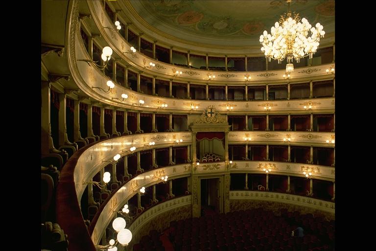 Dopo quasi quattro anni di lavoro il teatro - dotato di un ampio portico per le carrozze all'esterno, di numerosi locali di servizio (tra cui la spaziosa sala per la scenografia), di una sala dalla pianta a ferro di cavallo con quattro ordini di palchi e una galleria, oltre che un soffitto riccamente decorato - s'inaugurò la sera del 3 ottobre 1841 con l'opera Adelaide di Borgogna al Castello di Canossa, musicata da Alessandro Gandini (poesia di Carlo Malmusi) cui seguì il ballo Rebecca, con coreografie di Emanuele Viotti e scenografie di Camillo Crespolani.