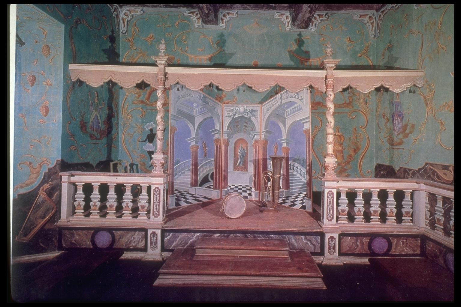 In occasione dei restauri al Castello di Vigoleno, realizzati per volontà della principessa Maria Ruspoli Gramont (proprietaria del maniero tra il 1922 e il 1934) avendo ella deciso di risistemare e rendere abitabile l'intero castello che versava in grave stato di abbandono, vi fu adattato a teatrino una sala rettangolare posta al primo piano dell'edificio. All'artista russo Alexandre Jacovlef fu dato incrico di decorare le pareti della sala. Il pittore realizzò a tinte vivaci decori di gusto cinesizzante, rappresentando animali, maschere, figure esotiche e danzanti dalla connotazione simbolica, musici e dame in abiti settecenteschi, tra cui ritrasse la stessa principessa e una fitta vegetazione con tralci. Mentre al centro della scena una rappresentazione stilizzata del borgo medioevale riconduce al realismo magico di Gino Severini.