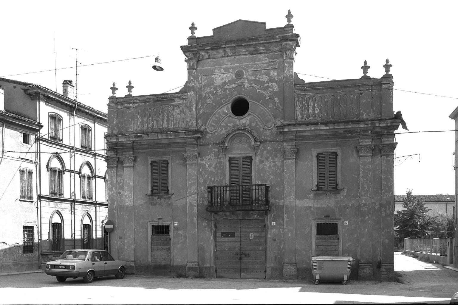 Sorge sulle rovine dell'antico teatro costruito nel 1488 su disegno di Luca Faucelli discepolo del più illustre Leon Battista Alberti. Questo teatrino eretto esattamente negli edifici che componevano l'insieme edilizio annesso al Palazzetto Ducale fu commissionato per le nozze di Rodolfo Gonzaga con Caterina Pico della Mirandola. Doveva essere molto piccolo e rispecchiare l'usanza dei teatrini di corte, ma bene o male continuà la sua attività per alcuni secoli dato che nei abbiamo notizia ancora nel 1770 e nel 1774, quando una piccola compagnia filodrammatica dialettale, cambiò sede. Trasferendosi da questo teatro al nuovo teatrino costruito per l'occasione nella locale scuola d'arte. Si hanno notizie di altre recite nel 1813 nella chiesa di Santa Croce, in una Sala del fabbricato detto della Macina, demolita negli anni cinquanta nel sito dove ora è stata edificata la Cassa di Risparmio. In questo anno, un comitato di cittadini costituì una società per fabbricare un teatro per uso dei dilettanti e per lasciare testimonianza di perenne memoria al proprio paese ( Caselli, p. 56).