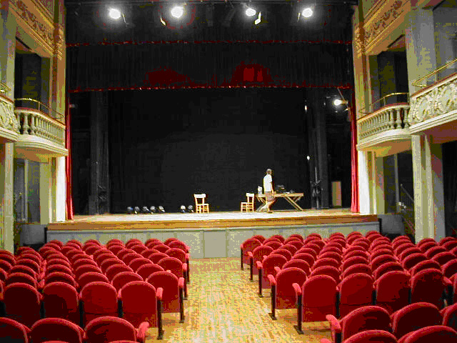 "Sul finire del secolo XIX a Rubiera veniva risistemato il Teatro Comunale, sito nel fabbricato comunale antica Posta. Il teatro, collocato al primo piano (attuale ala nord di Palazzo Sacrati) era composto di platea, loggia e palcoscenico, e poteva contenere circa 120 persone nella platea e 70 nella loggia, con una capienza massima, quindi, di circa 200 persone". (cit.