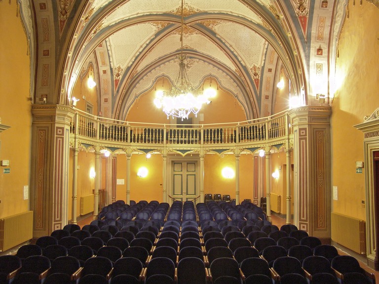 Fu costruita un'elegante galleria ed approntato un impianto d'illuminazione a gas. Per la decorazione della sala e della contigua Sala Rossa furono chiamati i pittori perugini Lemmo Rossi Scotti e Matteo Tassi.